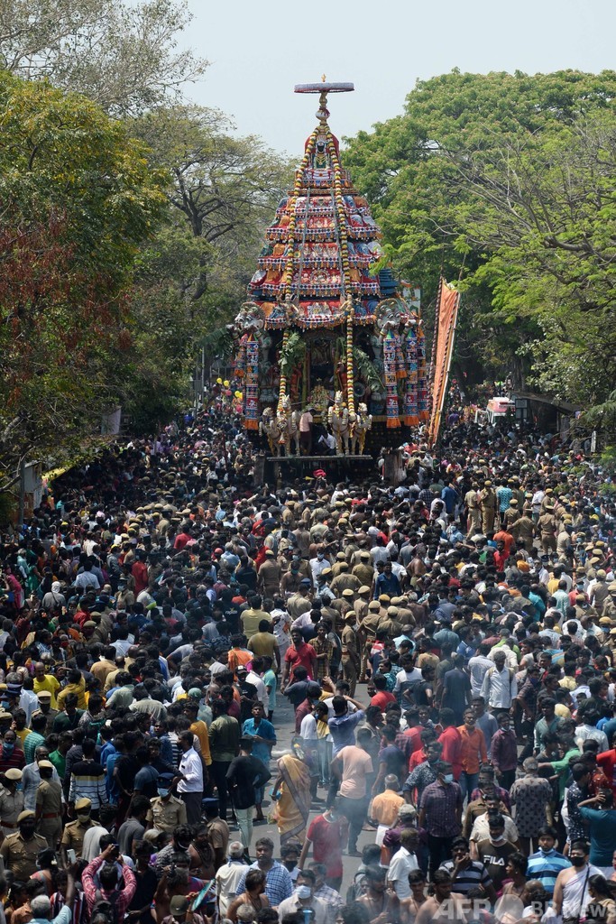 【3月26日 AFP】インド南部タミルナド(Tamil Nadu)州チェンナイ(Chennai)で25日、年に一度のヒンズー教の祭りが開かれ、花や彫刻で飾られた山車が登場した。カパレーシュワラ寺院(Kapaleeswarar Temple)には、大勢の信者が集まった。(c)AFP