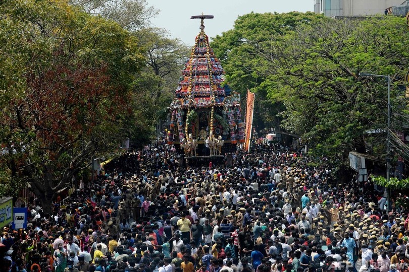 【3月26日 AFP】インド南部タミルナド(Tamil Nadu)州チェンナイ(Chennai)で25日、年に一度のヒンズー教の祭りが開かれ、花や彫刻で飾られた山車が登場した。カパレーシュワラ寺院(Kapaleeswarar Temple)には、大勢の信者が集まった。(c)AFP