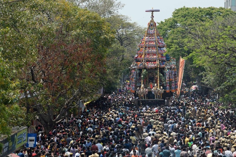 【3月26日 AFP】インド南部タミルナド(Tamil Nadu)州チェンナイ(Chennai)で25日、年に一度のヒンズー教の祭りが開かれ、花や彫刻で飾られた山車が登場した。カパレーシュワラ寺院(Kapaleeswarar Temple)には、大勢の信者が集まった。(c)AFP