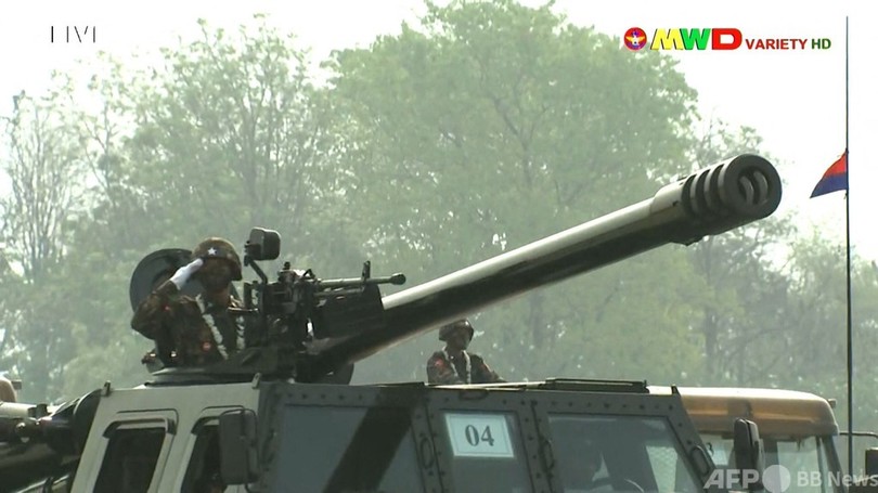 【3月27日 AFP】(更新、写真追加)ミャンマー国軍は27日、首都ネピドーで毎年恒例の「国軍記念日(Armed Forces Day)」の式典を開催し、軍事パレードで武力を誇示した。同国のミン・アウン・フライン(Min Aung Hlaing)国軍総司令官は、クーデターを正当化すると同時に、選挙後は権力を移譲すると主張した。一方、同日行われた反クーデターデモに対する弾圧の死者は、目撃者らの証言によると全国で少なくとも19人に上っている。