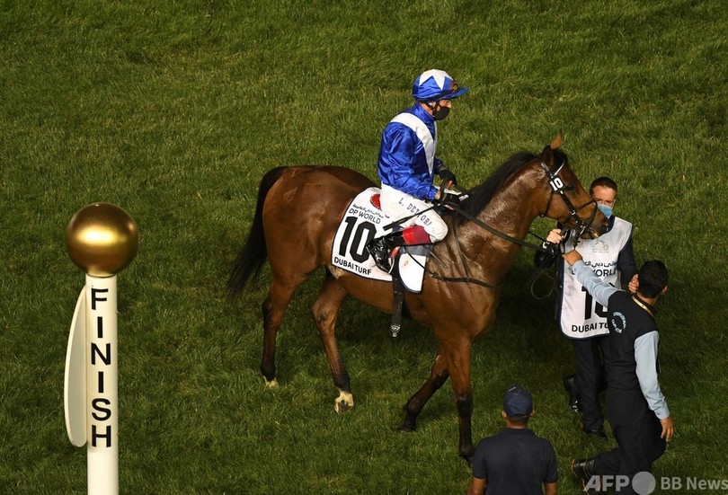 同日の他のレースでは、ドバイ・シーマ・クラシック(Dubai Sheema Classic 2021)をミシュリフ(Mishriff)、ドバイ・ターフ(Dubai Turf 2021)をロードノース(Lord North)が制し、英国のジョン・ゴスデン(John Gosden)調教師が2冠を達成した。(c)AFP