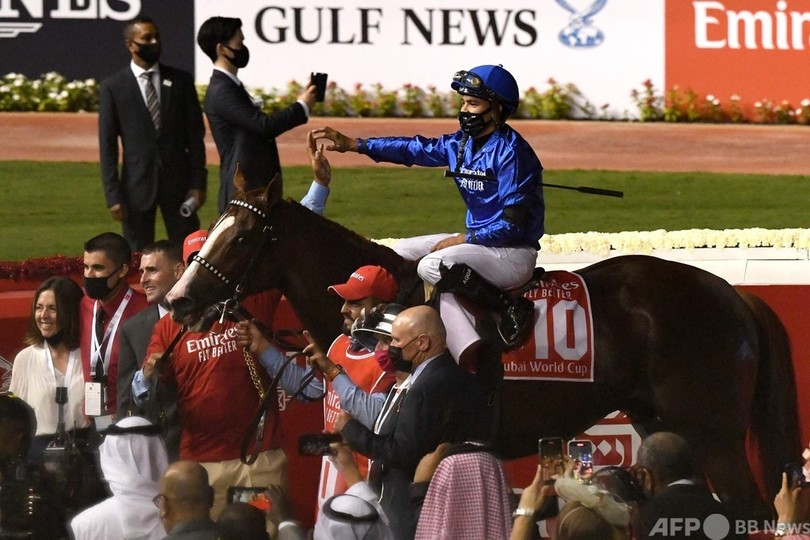 同日の他のレースでは、ドバイ・シーマ・クラシック(Dubai Sheema Classic 2021)をミシュリフ(Mishriff)、ドバイ・ターフ(Dubai Turf 2021)をロードノース(Lord North)が制し、英国のジョン・ゴスデン(John Gosden)調教師が2冠を達成した。(c)AFP