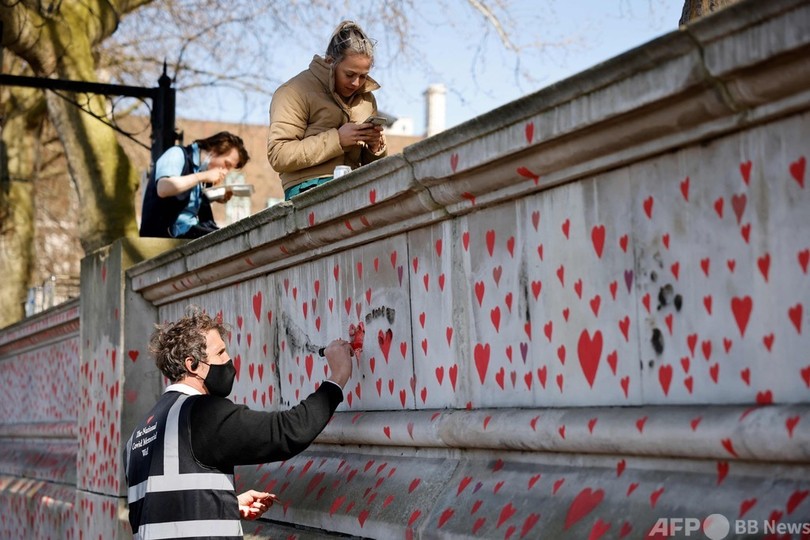 【4月14日 AFP】新型コロナウイルス感染症(COVID-19)の犠牲者を悼み、テムズ川(River Thames)南側の堤防の壁に描かれた赤いハート。この壁画は約15万もの手描きのハートで作られた。英ロンドンで。(c)AFP