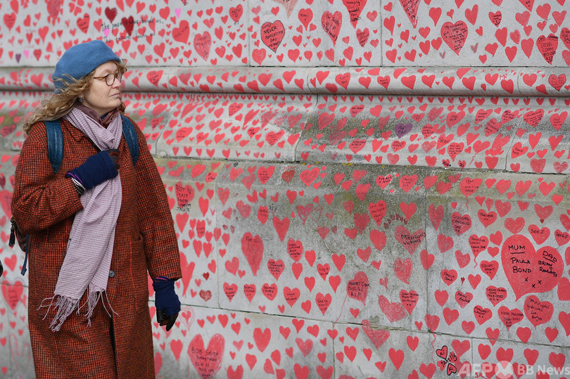 【4月14日 AFP】新型コロナウイルス感染症(COVID-19)の犠牲者を悼み、テムズ川(River Thames)南側の堤防の壁に描かれた赤いハート。この壁画は約15万もの手描きのハートで作られた。英ロンドンで。(c)AFP