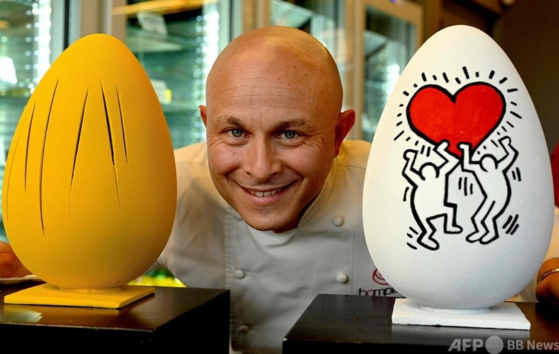 チョコレートのイースターエッグを手掛けたのは、パティシエのウォルター・ムスコ(Walter Musco)さん。草間彌生(Yayoi Kusama)さんやジャンミシェル・バスキア(Jean-Michel Basquiat)ら著名アーティストの作品をイメージしたイースターエッグの他、伊女優のジュリエッタ・マシーナ(Giulietta Masina)や英作家ジョージ・オーウェル(George Orwell)をモチーフにしたものも登場した。(c)AFP