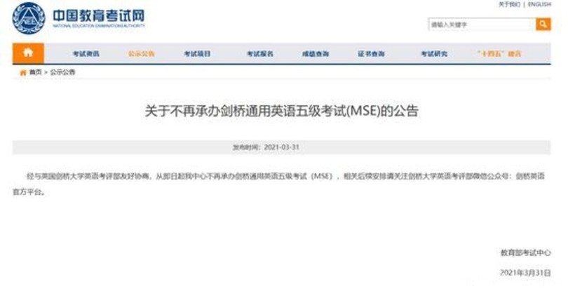 【4月2日 CGTN Japanese】中国教育部試験センターは3月31日に公式サイトで、「当日から、教育部試験センターはケンブリッジ英検の計5級のMSE検定の運営を中止する」と発表しました。MSE検定は初級から順にKET、PET、FCE、CAE、CPEの5級があります。