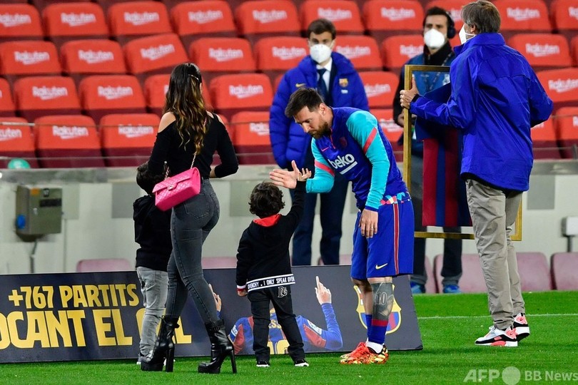 シャビ・エルナンデス(Xavi Hernandez)氏が持っていたクラブ最多記録の通算767試合出場に前月並び、これがバルセロナでの同769試合目となったメッシは試合前、ピッチ上で家族とともに額縁に入った記念のユニホームを受け取った。(c)AFP/Thomas ALLNUTT