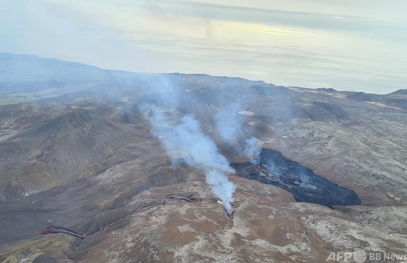 アイスランドの市民保護当局が公開した映像によると、マグマは新しい亀裂から数百メートルにわたって細長く流れ、一帯は噴煙に包まれている。