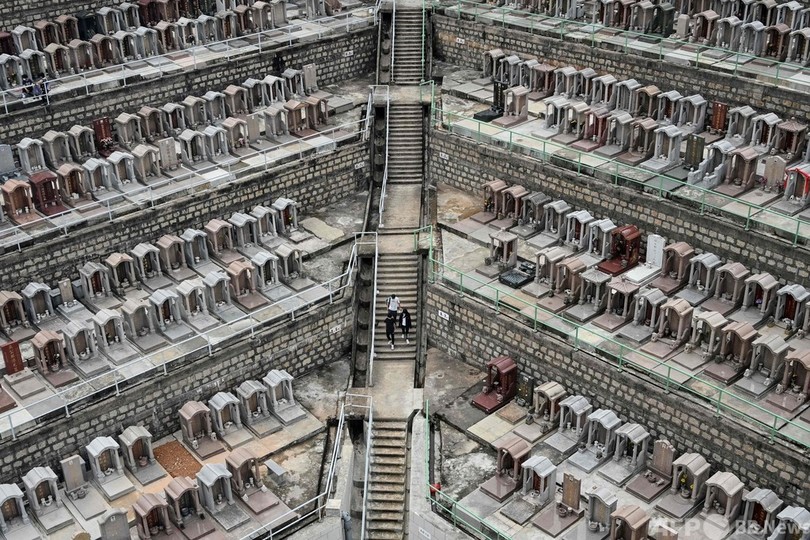 【4月6日 AFP】先祖を祭る中国の伝統行事「清明節(Qingming Festival)」を迎えた香港で、墓参りをする人々。清明節は死者を弔う日で、人々は墓掃除をしたり供え物を燃やしたりして、祖先に敬意を表する。(c)AFP