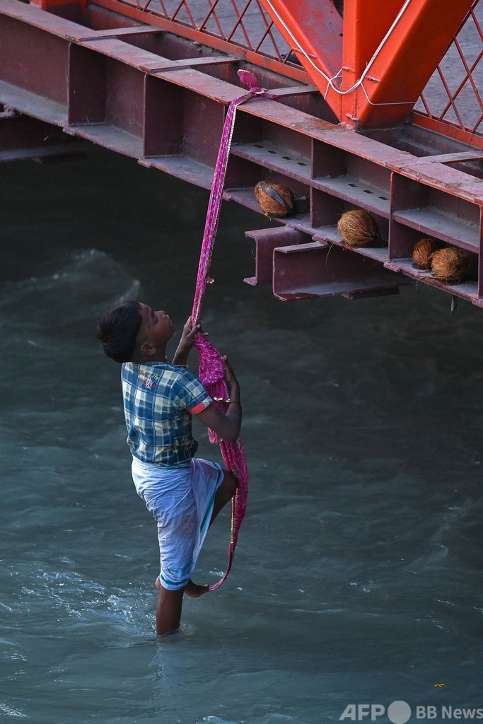 【4月13日 AFP】ヒンズー教の聖地、インド北部ハリドワール(Haridwar)では巡礼者が、魂が清められると信じガンジス(Ganges)川に身を沈める。その傍らで少年は、富を求めガンジス川に身を沈める。