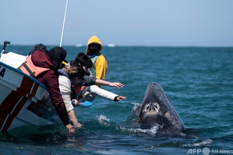 【4月17日 AFP】フジツボを付けた大きなコククジラが、興奮する観光客を乗せた小舟の横で子クジラに鼻をこすり付けている。メキシコ北西部バハカリフォルニア(Baja California)半島沖の風景だ。