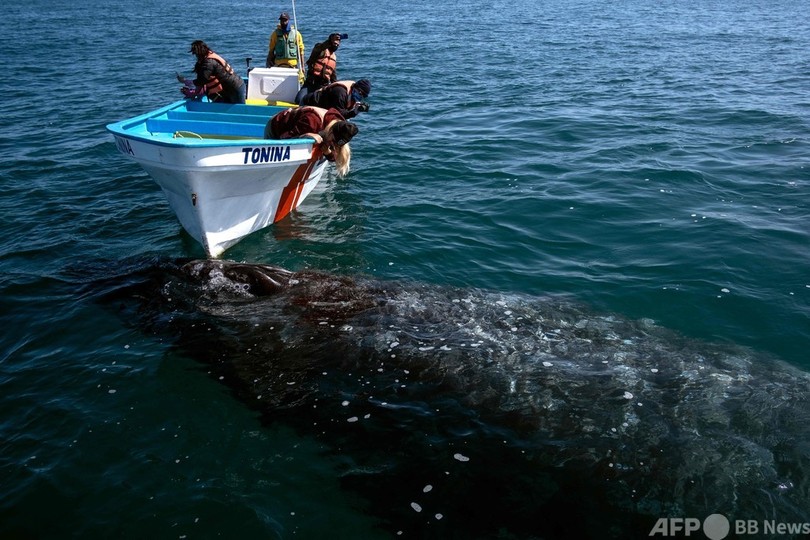 【4月17日 AFP】フジツボを付けた大きなコククジラが、興奮する観光客を乗せた小舟の横で子クジラに鼻をこすり付けている。メキシコ北西部バハカリフォルニア(Baja California)半島沖の風景だ。