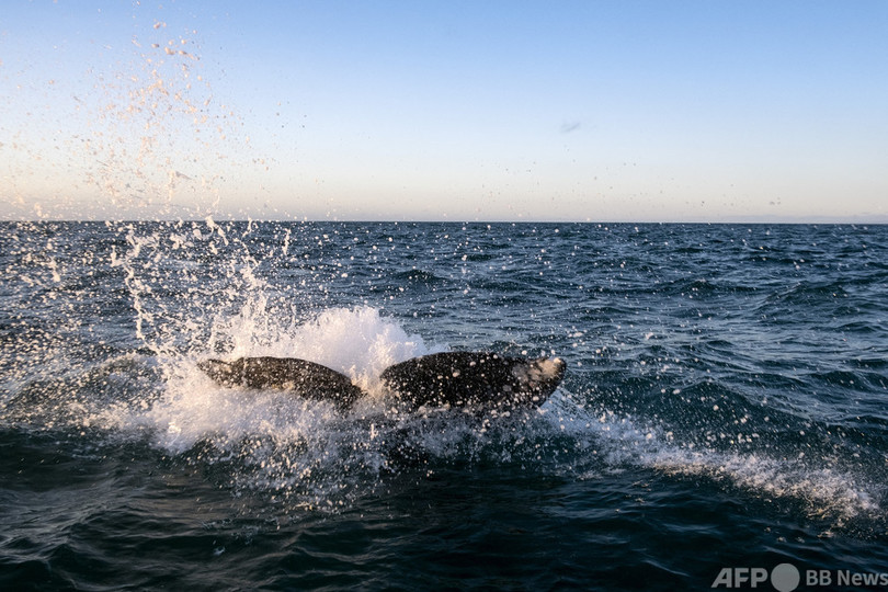 大きさはザトウクジラと同程度だが、斑点のある灰色の体が特徴で、大きいもので15メートルほど、体重は30~40トンにもなる。(c)AFP/Guillermo Arias