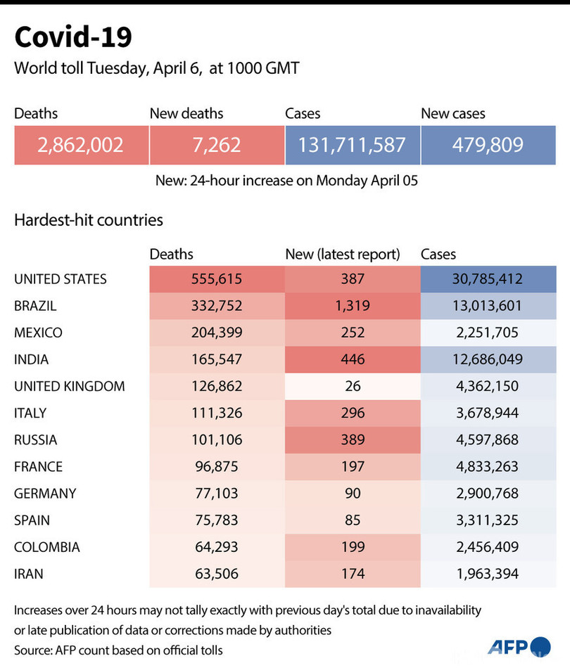 【4月7日 AFP】AFPが各国当局の発表に基づき日本時間6日午後7時にまとめた統計によると、世界の新型コロナウイルスによる死者数は286万2002人に増加した。