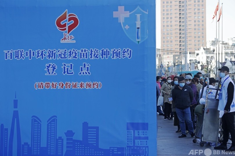 【4月10日 CNS】上海市普陀区(Putuo)長征鎮(Changzheng)の中環百聯ショッピングエリアで5日、外に設置された新型コロナウイルスワクチンの臨時予約所の前に、多くの市民が行列を作っていた。