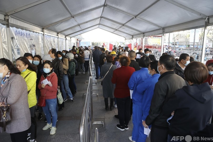 【4月10日 CNS】上海市普陀区(Putuo)長征鎮(Changzheng)の中環百聯ショッピングエリアで5日、外に設置された新型コロナウイルスワクチンの臨時予約所の前に、多くの市民が行列を作っていた。