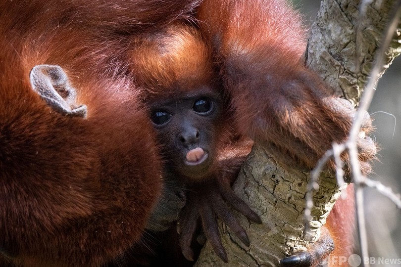 お母さんの腕から「ぺろ」 アカホエザルの赤ちゃん 仏