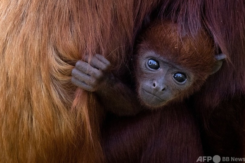 お母さんの腕から「ぺろ」 アカホエザルの赤ちゃん 仏