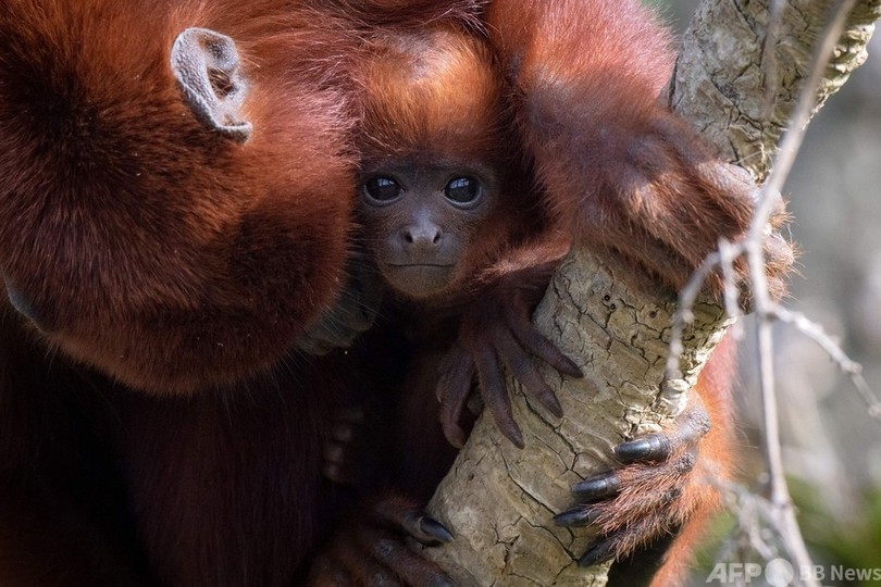 お母さんの腕から「ぺろ」 アカホエザルの赤ちゃん 仏