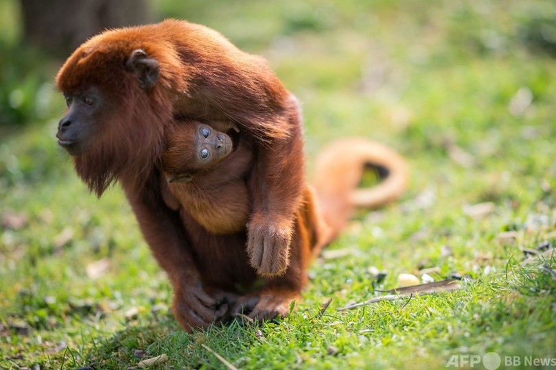 お母さんの腕から「ぺろ」 アカホエザルの赤ちゃん 仏