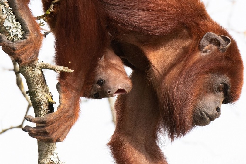 お母さんの腕から「ぺろ」 アカホエザルの赤ちゃん 仏