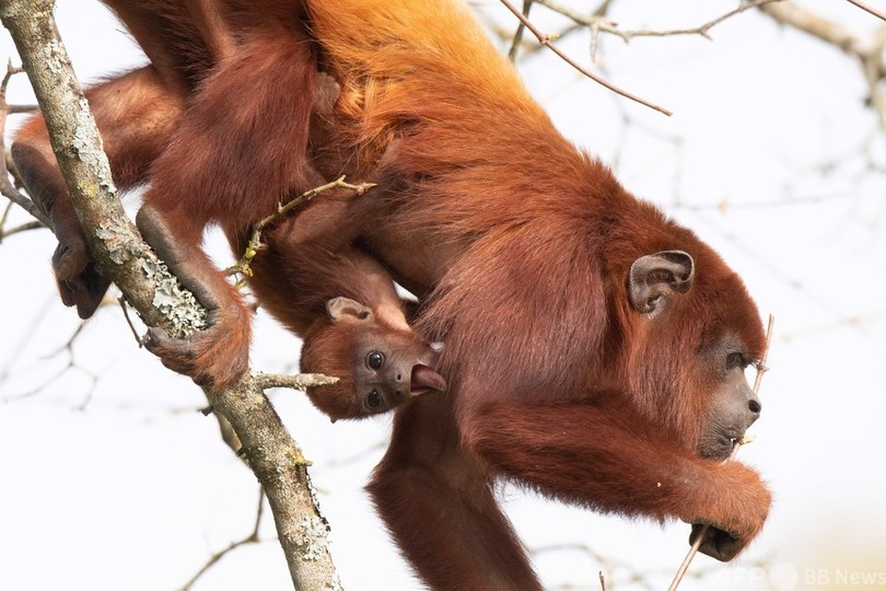 お母さんの腕から「ぺろ」 アカホエザルの赤ちゃん 仏