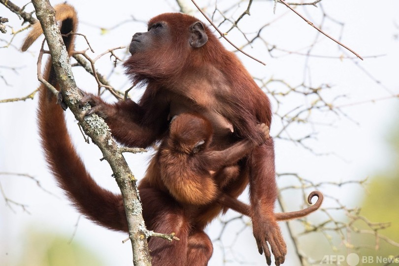 お母さんの腕から「ぺろ」 アカホエザルの赤ちゃん 仏