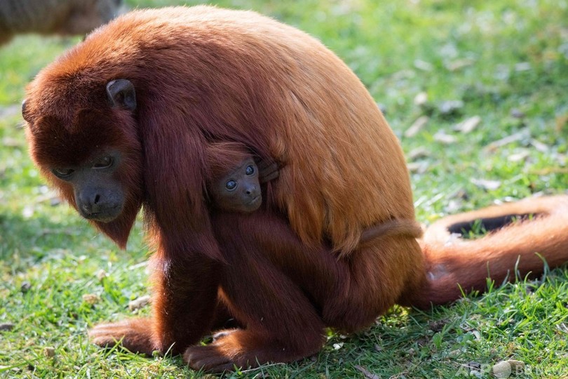 お母さんの腕から「ぺろ」 アカホエザルの赤ちゃん 仏