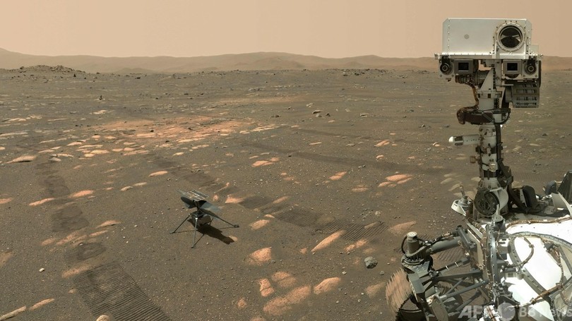 写真は探査車「パーシビアランス(Perseverance)」から撮影されたもので、インジェニュイティがパーシビアランスから離れ、4本の脚部で火星に着地している様子などが捉えられている。(c)AFP