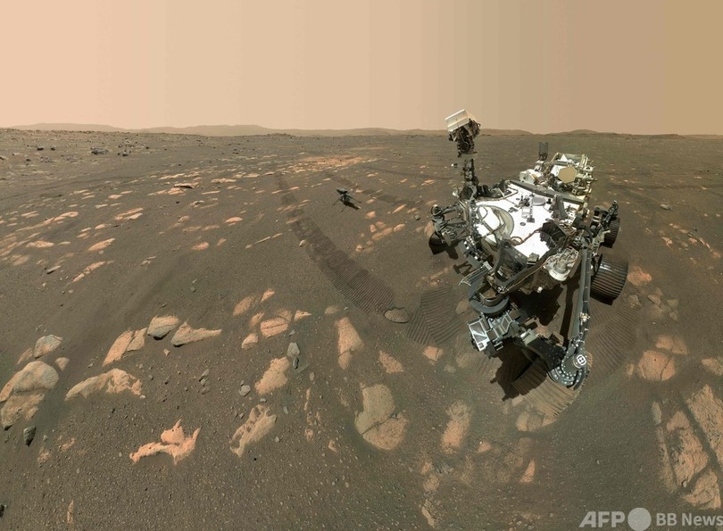 写真は探査車「パーシビアランス(Perseverance)」から撮影されたもので、インジェニュイティがパーシビアランスから離れ、4本の脚部で火星に着地している様子などが捉えられている。(c)AFP