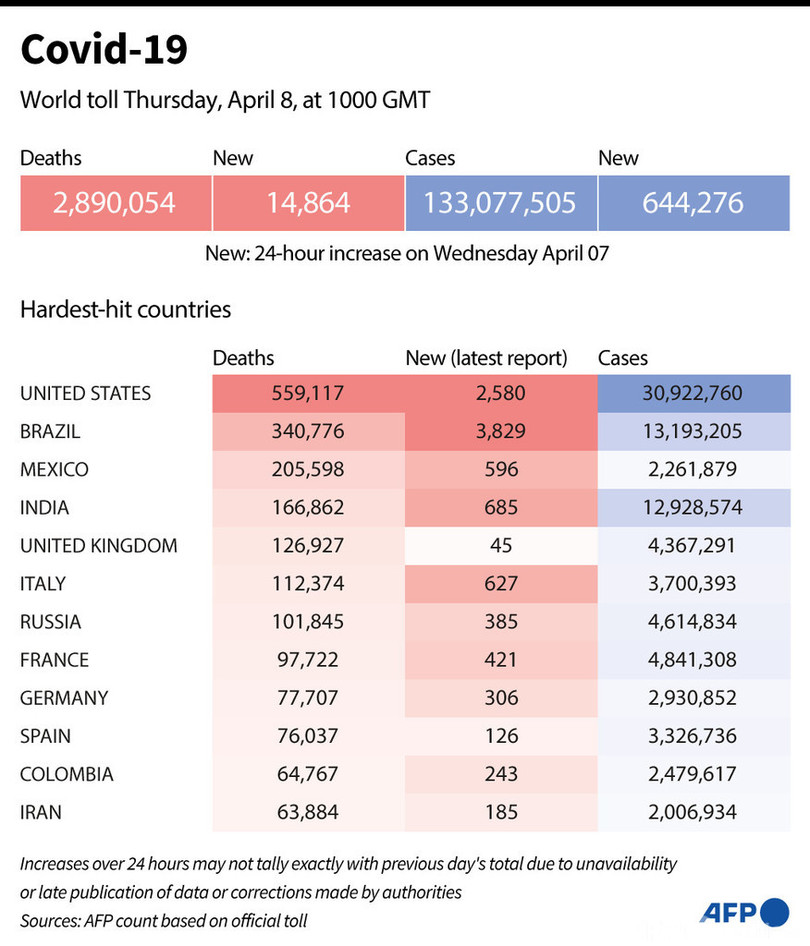 新型コロナウイルス、現在の感染者・死者数(8日午後7時時点) 死者289万人に