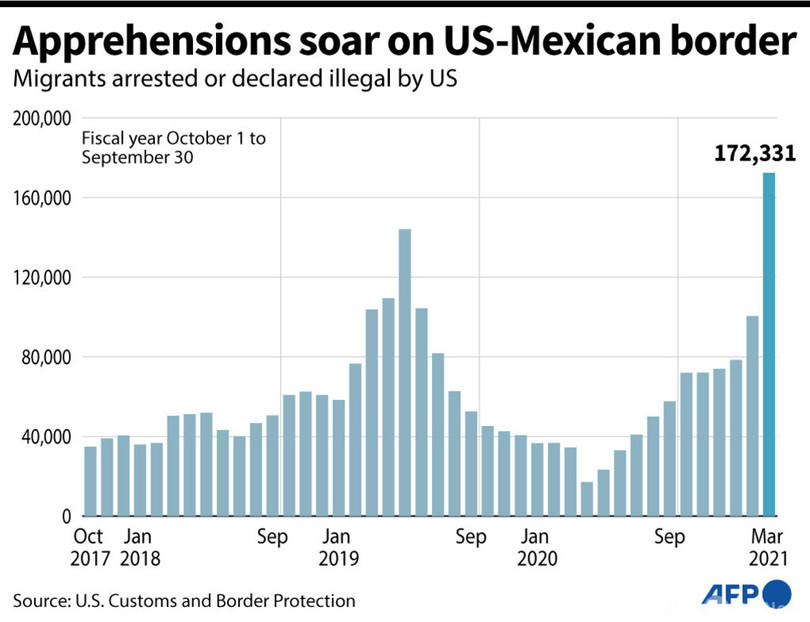 【4月9日 AFP】米国のメキシコ国境で3月に拘束された不法移民の数が、前月比70%増の17万2331人と、15年ぶりの高水準となった。税関・国境警備局(CBP)が8日発表した。ジョー・バイデン(Joe Biden)政権は移民問題をめぐり増大する課題に直面している。