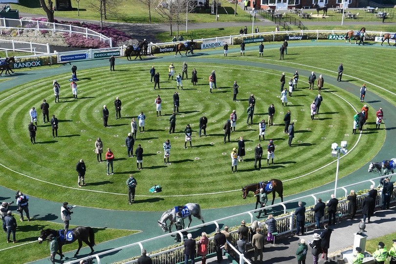 若い頃はポロの選手だったフィリップ殿下は毎年、競馬好きのエリザベス女王に同行して伝統レースのロイヤルアスコット(Royal Ascot)を訪れていた。この日のエイントリー競馬場では半旗が掲げられ、騎手はフィリップ殿下に弔意を表し、黒の腕章をつけた。(c)AFP