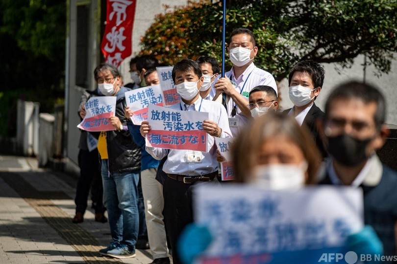 【4月12日 AFP】東日本大震災で被災した東京電力(TEPCO)福島第1原子力発電所から出る放射性物質を含む処理水を、海洋に放出する方針を政府が固めたことを受けて、これに反対する市民団体などが12日、都内の首相官邸前で抗議デモを行った。(c)AFP
