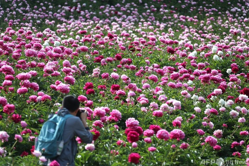 洛陽にある牡丹の主要観賞地の一つである王城公園では、580種以上、8万株近くの牡丹がすでに満開しました。このほか、洛陽隋唐遺跡植物園内には、全体の58%を占める620種類以上の牡丹が開花しました。(c)CGTN Japanese/AFPBB News