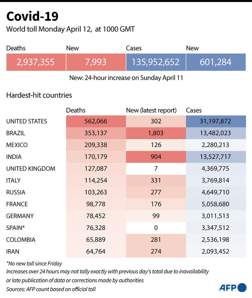 【4月13日 AFP】AFPが各国当局の発表に基づき日本時間12日午後7時にまとめた統計によると、世界の新型コロナウイルスによる死者数は293万7355人に増加した。