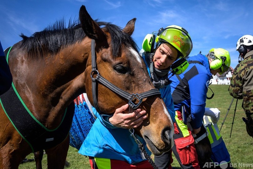 【4月20日 AFP】スイス・セーニュレジエ(Saignelegier)で行われた負傷した馬の搬送を想定した訓練で、ヘリコプターにつり下げられて運ばれる馬。馬の輸送と医療施設への馬の迅速な搬送のための訓練で、スイス軍と獣医学研究施設が合同で行った。(c)AFP