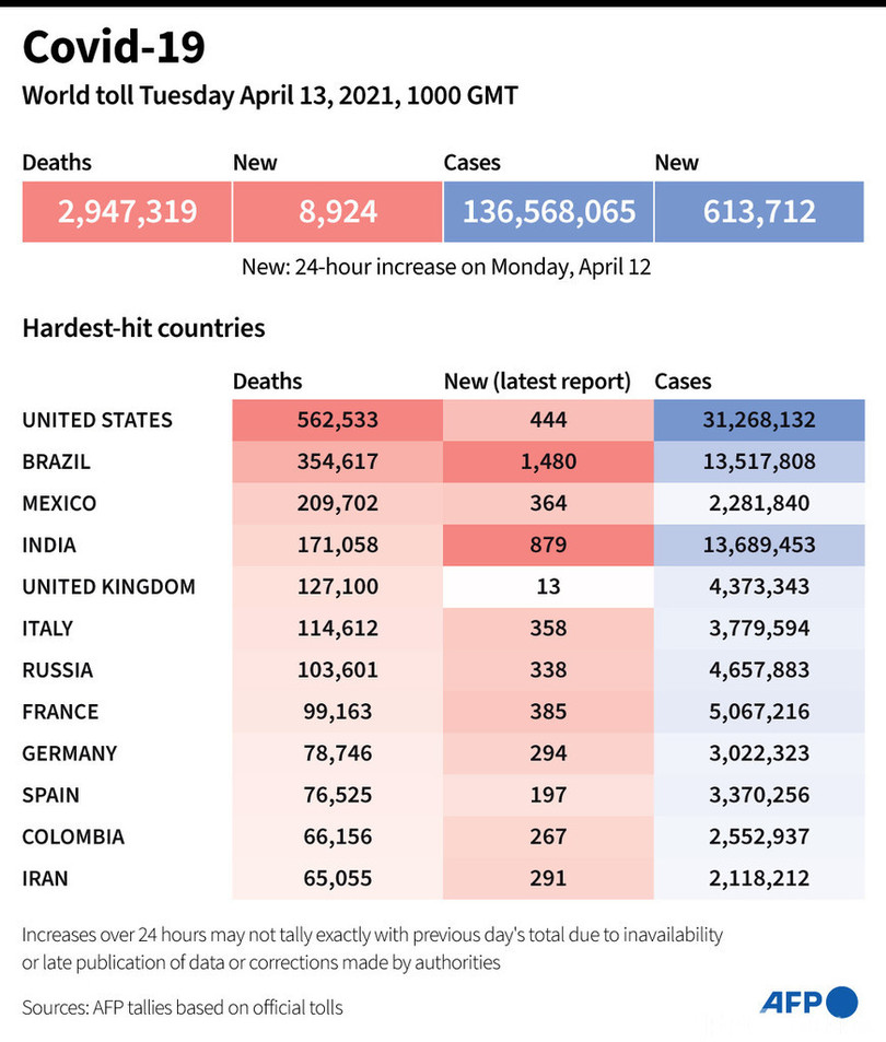 【4月14日 AFP】AFPが各国当局の発表に基づき日本時間13日午後7時にまとめた統計によると、世界の新型コロナウイルスによる死者数は294万7319人に増加した。