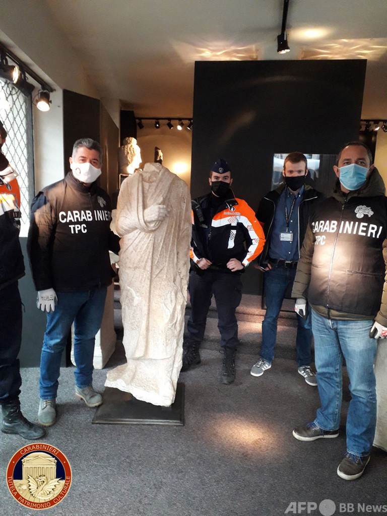 イタリア警察軍カラビニエリ(Carabinieri)美術品捜査班の発表によると、頭部のない男性の全身彫刻「トガトゥス(Togatus)」は、古代ローマの外衣「トーガ」を身に着けた男性をモデルにしたもので、1世紀に制作された。2011年に首都ローマの邸宅から盗まれた。