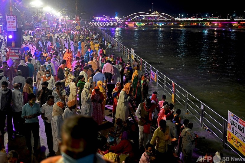 インドでは感染が急拡大しているが、ガンジス川には大勢の巡礼者が集まっており、その多くがマスクを着けていない。12日と13日にも巡礼者がひしめき合い、沐浴(もくよく)をする姿が見られた。