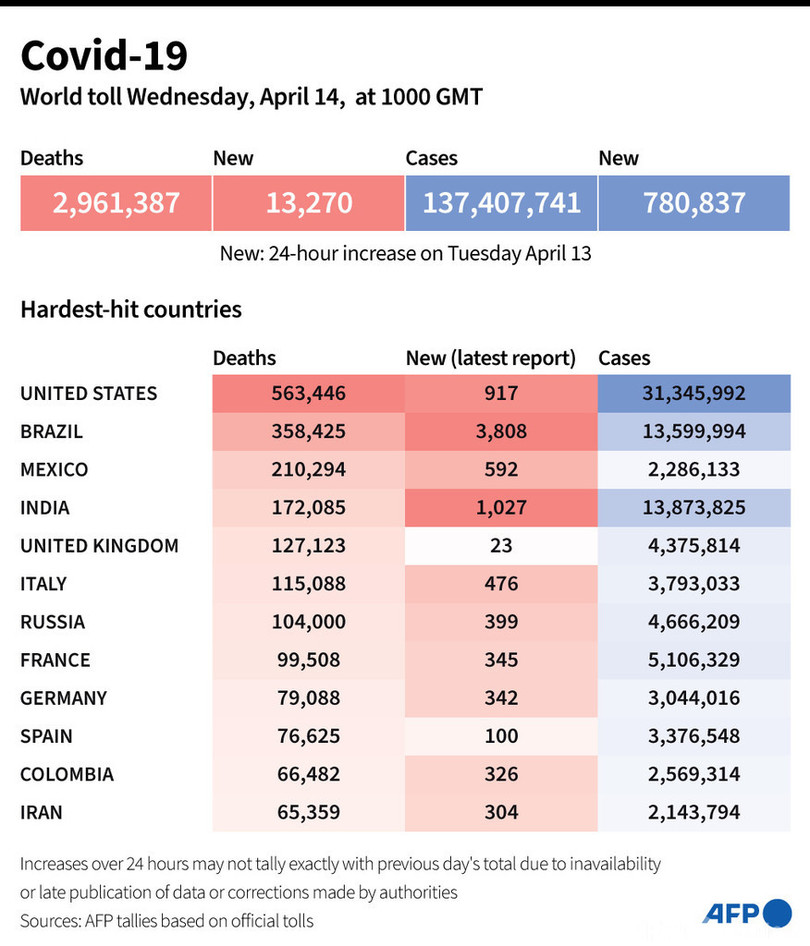 【4月14日 AFP】AFPが各国当局の発表に基づき日本時間14日午後7時にまとめた統計によると、世界の新型コロナウイルスによる死者数は296万1387人に増加した。