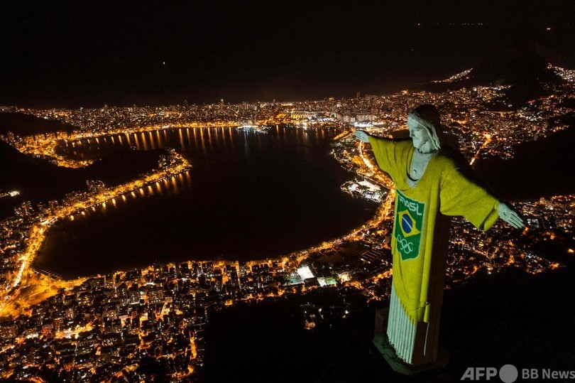 【4月15日 AFP】東京五輪の開幕まで残り100日となった14日、ブラジル・リオデジャネイロ(Rio de Janeiro)でキリスト像(Christ the Redeemer)がライトアップされた。像は、ブラジル国旗の色に包まれた。(c)AFP