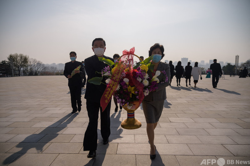 首都平壌では、マスク姿の市民らが市内を見下ろす万寿台(Mansu Hill)を訪れ、金日成氏と息子の故金正日(キム・ジョンイル、Kim Jong Il)総書記の巨大な銅像の足元に花を手向けた。