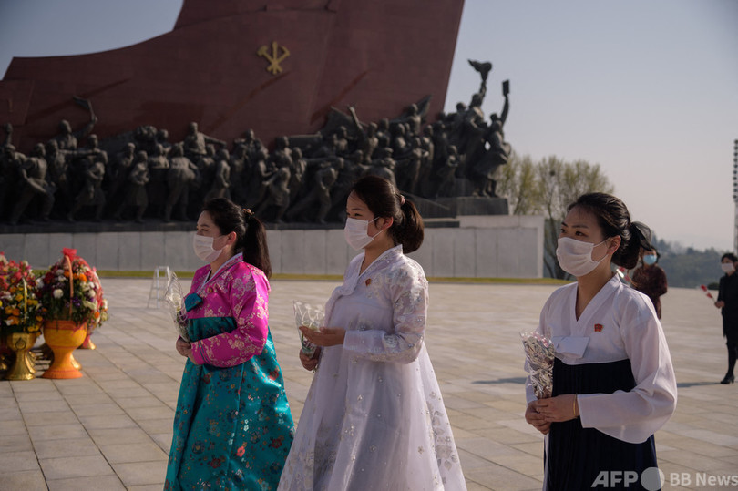 首都平壌では、マスク姿の市民らが市内を見下ろす万寿台(Mansu Hill)を訪れ、金日成氏と息子の故金正日(キム・ジョンイル、Kim Jong Il)総書記の巨大な銅像の足元に花を手向けた。