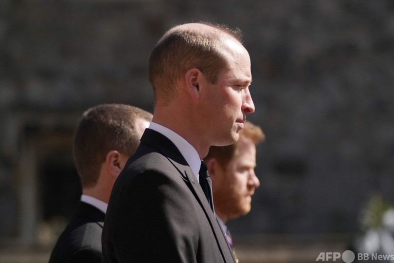 ひつぎを運んだ霊きゅう車は、殿下自らが設計に関わったランドローバー(Land Rover)の特別仕様車。その後ろには、息子のチャールズ皇太子(Prince Charles)とアンドルー王子(Prince Andrew)、エドワード王子(Prince Edward)、娘のアン王女(Princess Anne)に加え、孫のウィリアム王子(Prince William)とヘンリー王子(Prince Harry)兄弟らが行進した。女王はベントレー(Bentley)車に乗り、葬列に加わった。(c)AFP