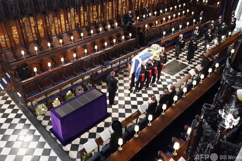 【4月17日 AFP】英ロンドン近郊のウィンザー城(Windsor Castle)内にある聖ジョージ礼拝堂(St George's Chapel)で17日、エリザベス女王(Queen Elizabeth II)の夫フィリップ殿下(Prince Philip)の葬儀が始まった。