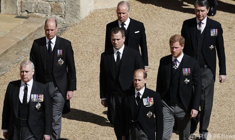 王子兄弟が公の場で対面したのは、ヘンリー王子が昨年、妻のメーガン妃(Meghan, Duchess of Sussex)と共に米国に移住して以降で初めて。王子2人の仲は、ヘンリー王子の移住や、メーガン妃と共に行った痛烈な王室批判をめぐり険悪となっているとも伝えられている。メーガン妃は現在、第2子を妊娠中で、医師から渡航を控えるよう勧められたため、葬儀は欠席した。(c)AFP