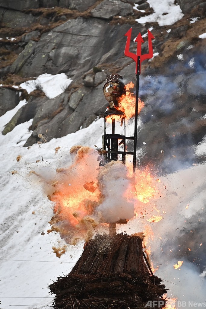 【4月20日 AFP】スイスの雪に覆われた山道に架かる橋で19日、チューリヒ伝統の春祭り「セクセロイテン(Sechselaeuten)」の儀式が行われ、まきの上に載せられた雪だるま形の巨大な人形が爆破された。