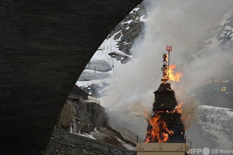 【4月20日 AFP】スイスの雪に覆われた山道に架かる橋で19日、チューリヒ伝統の春祭り「セクセロイテン(Sechselaeuten)」の儀式が行われ、まきの上に載せられた雪だるま形の巨大な人形が爆破された。