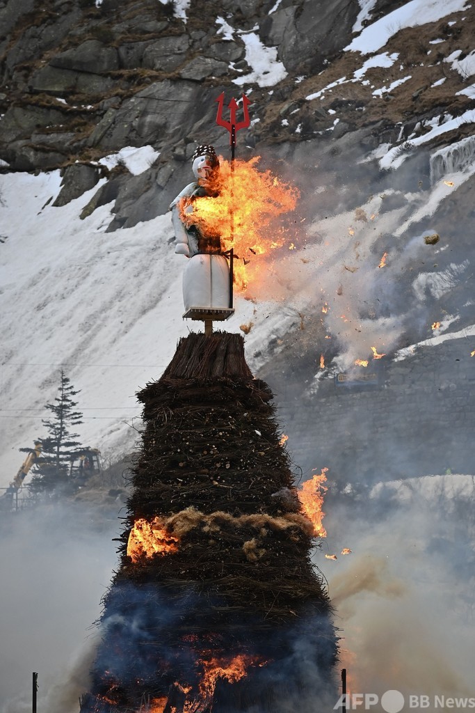 【4月20日 AFP】スイスの雪に覆われた山道に架かる橋で19日、チューリヒ伝統の春祭り「セクセロイテン(Sechselaeuten)」の儀式が行われ、まきの上に載せられた雪だるま形の巨大な人形が爆破された。